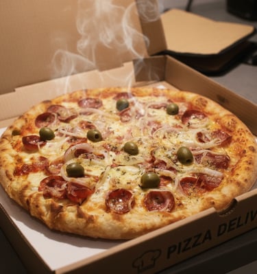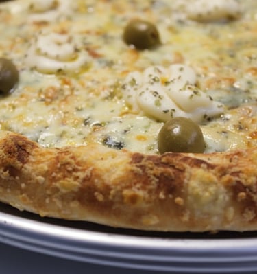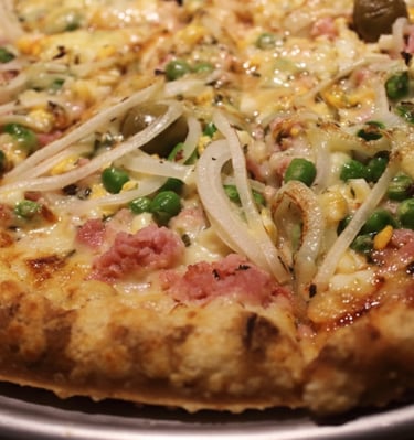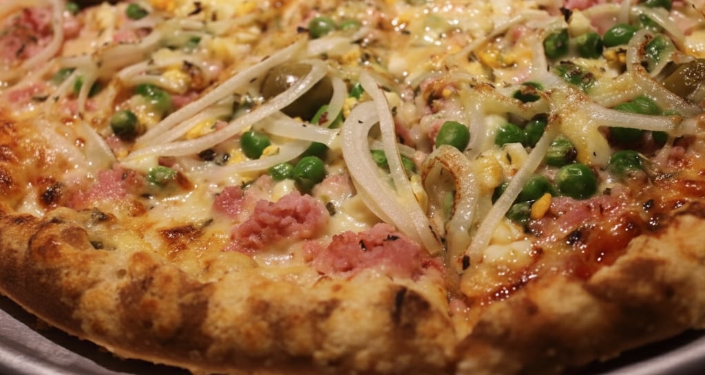 Presunto, ovos, ervilhas e azeitonas pretas.